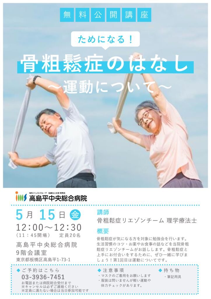 骨粗鬆症が気になる方を対象に勉強会を行います。生活習慣のコツ・お薬やお食事の話などを当院骨粗鬆症リエゾンチームがお話しします。 骨粗鬆症と上手にお付合いをするために、ぜひ一緒に学びましょう! 第1回目は運動についてです。