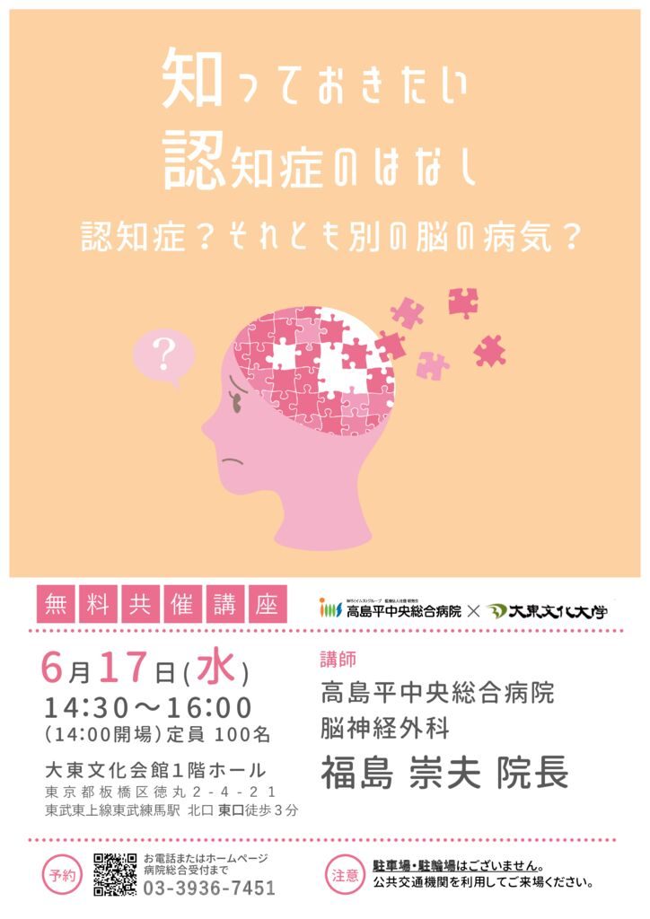 最近物忘れが増えたけど認知症かも…?でも病院にいく程じゃないし…と放っておいてませんか?検査をしてみると実は年齢による認知症に隠れて脳腫瘍や水頭症など別の脳の病気になっている事もあるんです。 そんな知っているようで知らない”認知症”について、診断や治療など認知症に関わる脳の話を当院脳神経外科福島院長が分かりやすくお話します!