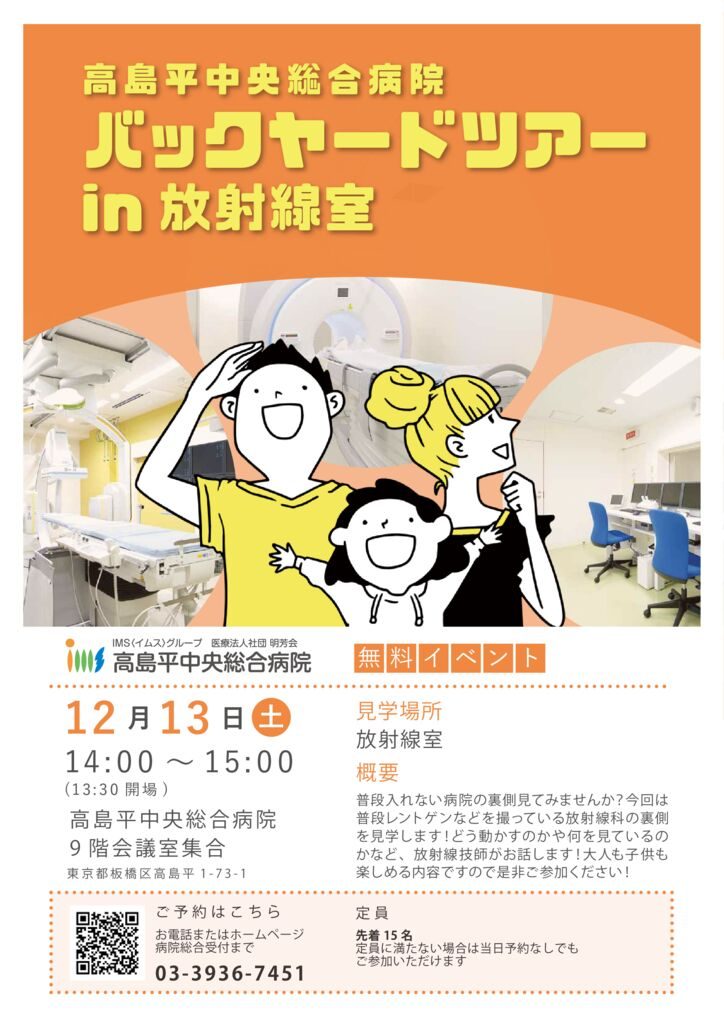 普段入れない病院の裏側見てみませんか?今回は普段レントゲンなどを撮っている放射線科の裏側を見学します!どう動かすのかや何を見ているのかなど、放射線技師がお話します! 大人も子供も楽しめる内容ですので是非ご参加ください!