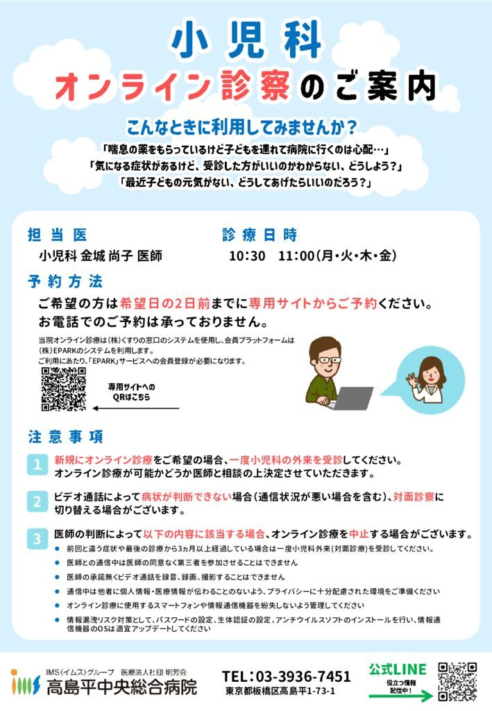 また、以前対面診療を行ったことがあっても、前回と違う症状や最後の診療から3ヵ月以上経過している場合は一度小児科外来(対面診療)を受診してください。