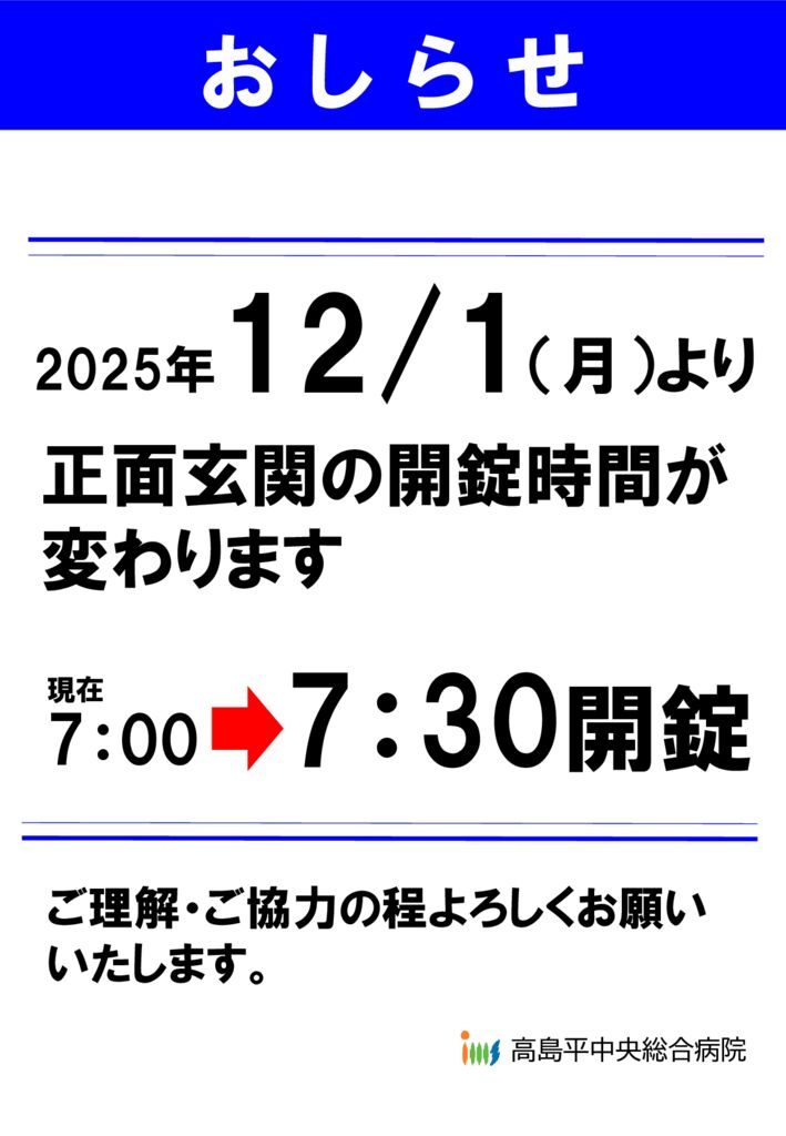 2025年12月1日(月)より感染症対策の一環として正面玄関の開錠時間が変わります。 ご理解・ご協力の程よろしくお願いいたします。